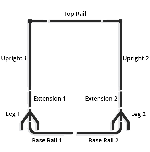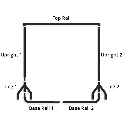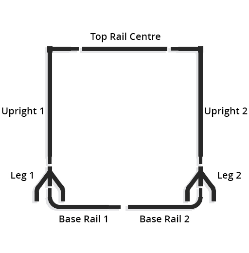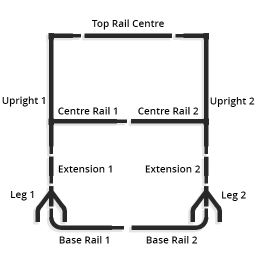 Connect the legs to the two sections of the base rail making sure the push pins ‘click’ into their locking holes, this should hold the bottom of the structure together Note: The legs will be leaning outwards slightly, this is normal. Then, attach one end of the top rail centre to one of the uprights, and then using the other end of the top rail centre, connect to the other upright so all three sections are fitted together securely.