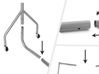 The 2 base bars will need to be connected together before attaching to the legs. Make sure the push pins are lined up and click into the corresponding fixing holes.