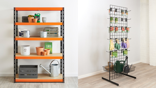 For heavier items, like big pots, compost bags, or bird feed, invest in some solid shelving. Shelves are also a game-changer for stacking planters and trays, plus they make a secure home for things like weedkiller that you’d rather keep out of reach.